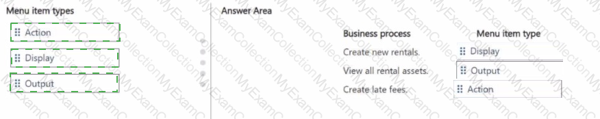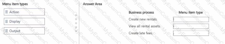 A company is creating custom functionality to manage rentals by using Dynamics 365 Supply Chain Management. You need to create menu items for the following business processes: