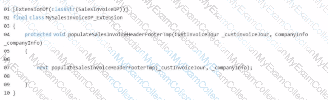 Solution: Create a new method on the MySaleslnvoiceDP_Extension class named populatelnvoiceHeaderfooterCustom which uses the CustlnvokeJour table as a parameter Declare the SalesTable and SaleslnvoiceHeaderFooterTmp tables on the new method. Populate the new fields by using the _custlnvoiceJour parameter to reference SalesTable.
