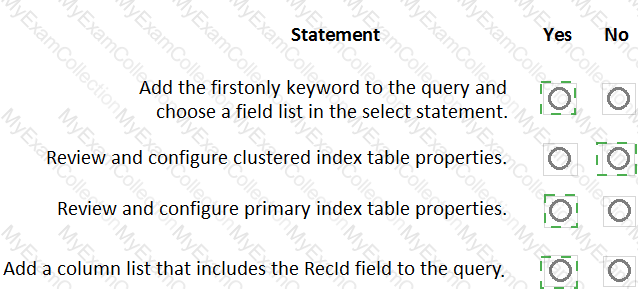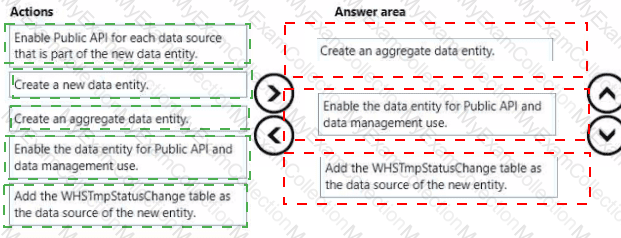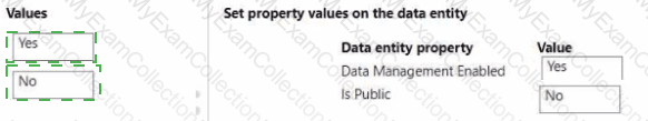 Which values should you set on the data entity properties? To answer, move the appropriate values to the correct data entity properties. You may use each value once, more than once, or not at all- You may need to move the split bar between panes or scroll to view content