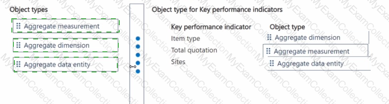 Which object types should you use? To answer, move the appropriate object types to the correct key performance indicators. You may use each object type once, more than once, or not at all. You may need to move the split bar between panes or scroll to view content.