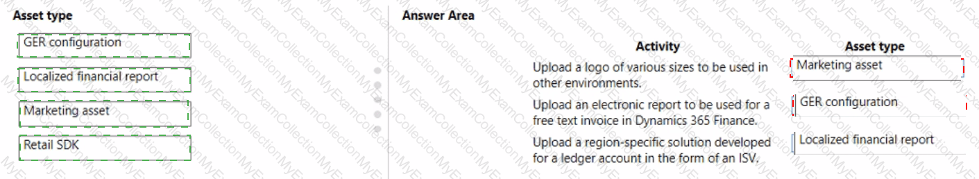 Which asset types should you use? To answer, drag the appropriate asset types to the correct activities. Each asset type may be used once, more than once, or not at all. You may need to drag the split bar between panes or scroll to view content.
