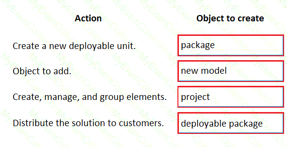 What should you create? To answer, drag the appropriate objects to the correct actions. Each element may be used once, more than once, or not at all. You may need to drag the split bar between panes or scroll to view content.
