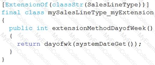 You must extend the class SalesLineType and add a new method that returns the day of week for the system’s current date as an integer value.