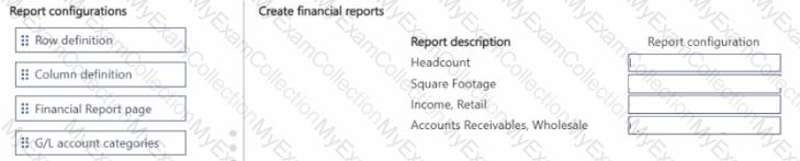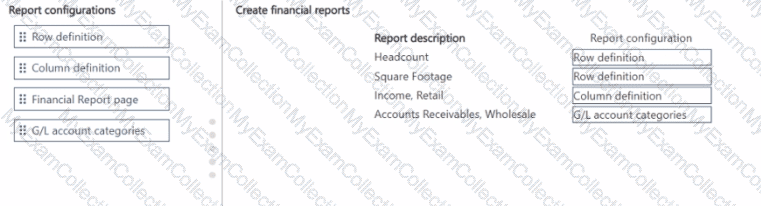 Which report configuration should you use to add the report descriptions lo financial reports? To answer, move the appropriate report configurations to the correct report descriptions. You may use each report configuration once, more than once, of not at all. You may need to move the split bar between panes or scroll to view content