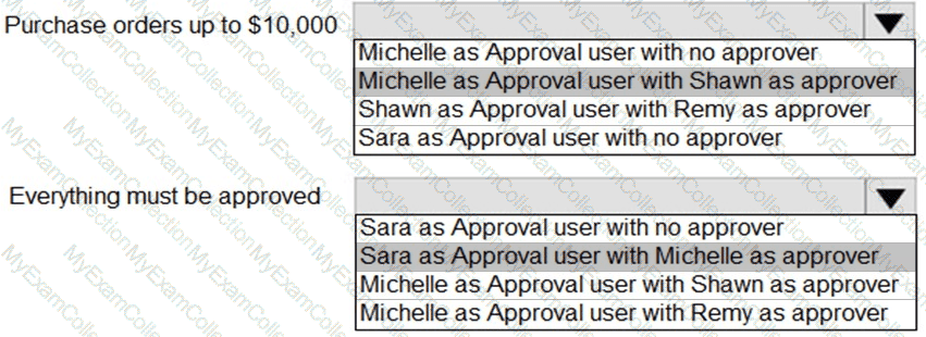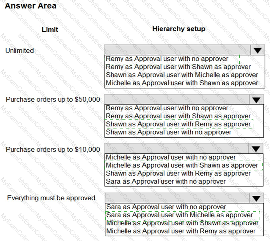 The accounting manager wants to set up a complete Purchase Document Approval system with an approval hierarchy that meets the following requirements: