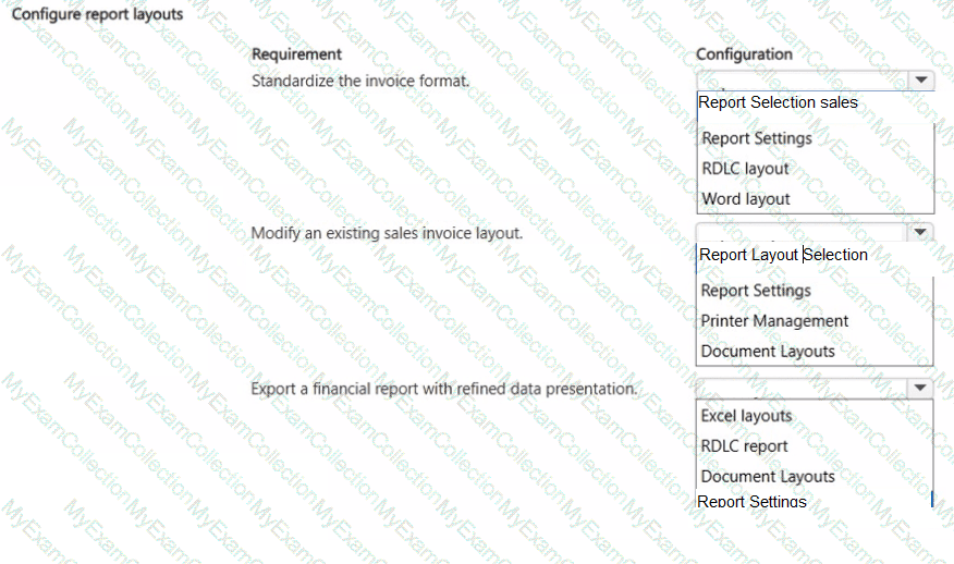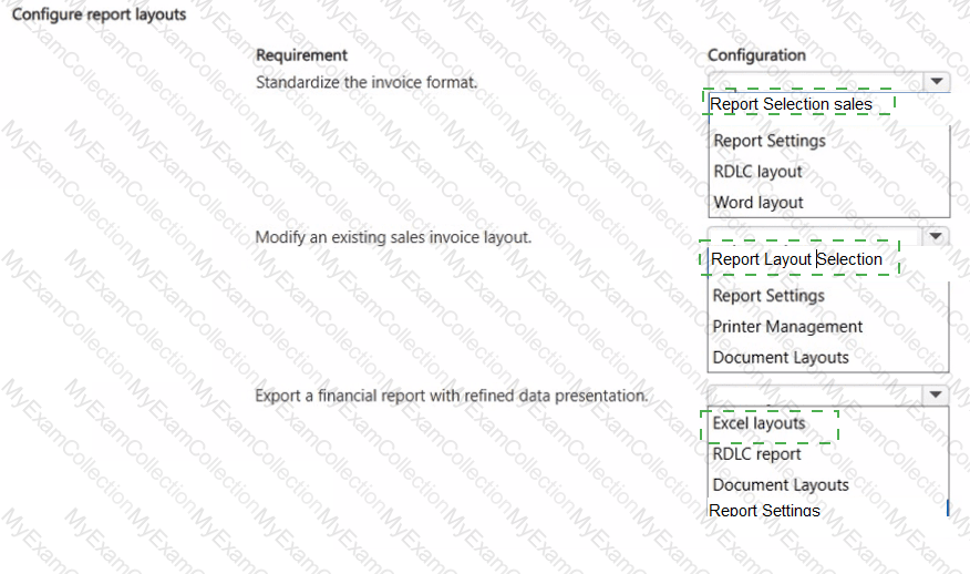 A company uses Dynamics 365 Business Central to manage its financial and operational processes. The company has the following configuration and document layout requirements: