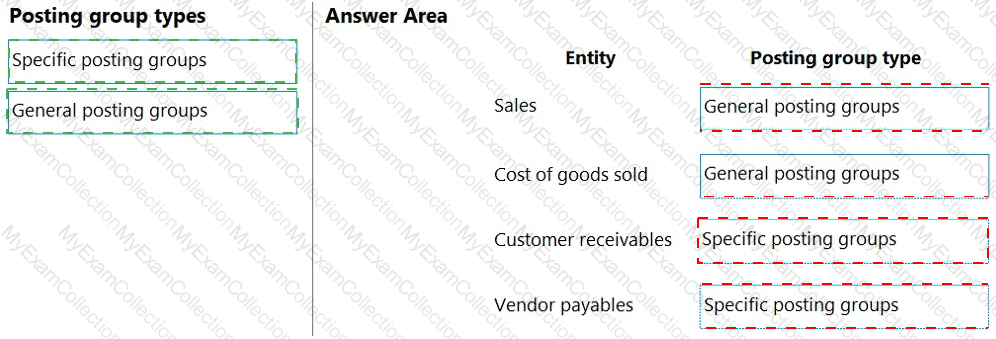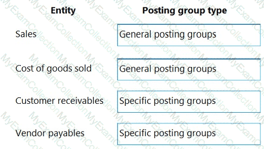 Which type of posting groups should you create? To answer, drag the appropriate posting group types to the correct entities. Each posting group type may be used once, more than once, or not at all. You may need to drag the split bar between panes or scroll to view content.