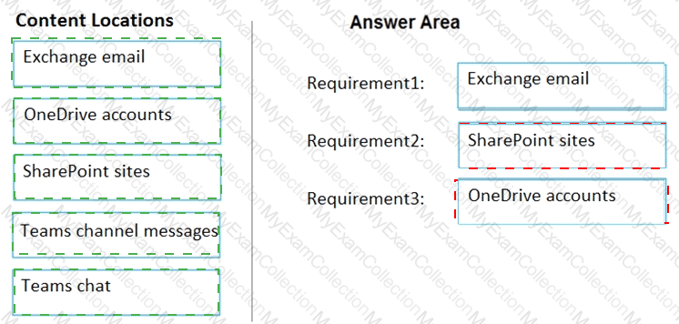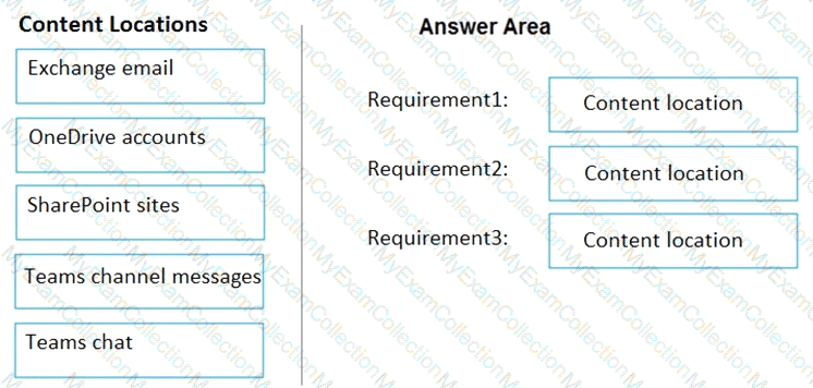Which content location should you include in the retention policies? To answer, drag the appropriate content locations to the correct requirements. Each content location may be used once, more than once, or not at all. You may need to drag the split bar between panes or scroll to view content.
