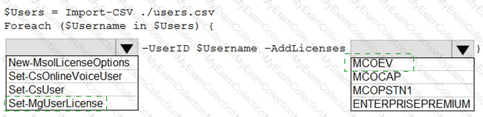 How should you complete the PowerShell script? To answer, select the appropriate options in the answer area.