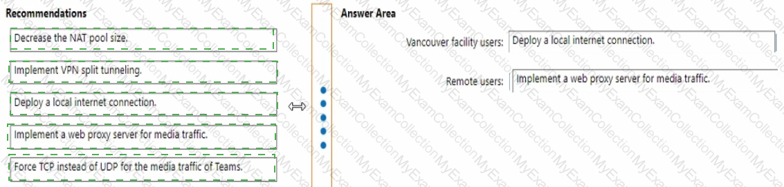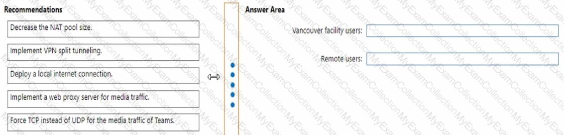 What should you recommend for the Vancouver facility users and the remote sale team users? To answer, drag the appropriate recommendation to the correct users. Each recommendation may be used once, more than once, or not at all. Vou may need to drag the split bar between panes or scroll to view content