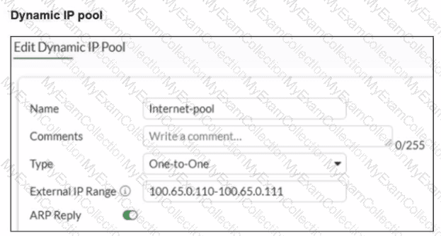 A diagram of a FortiGate device connected to the network, as well as the firewall policy and IP pool configuration on the FortiGate device are shown.