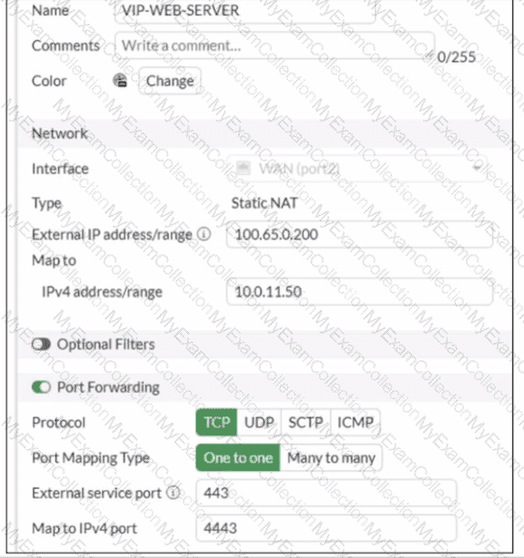 If the host 100.65.1.111 sends a TCP SYN packet on port 443 to 100.65.0.200. what will the source address, destination address, and destination port of the packet be at the time FortiGate forwards the packet to the destination?