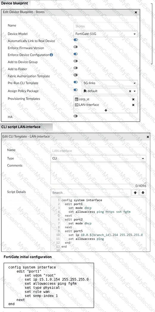 To prepare to onboard FortiGate devices to your company ' s stores, you configure the device blueprint and CLI scripts shown in the exhibit. Then, a technician prepares a FortiGate 90G with a basic configuration and connects it to the network. The basic configuration contains the port1 configuration and the minimal configuration required to allow the device to connect to FortiManager.