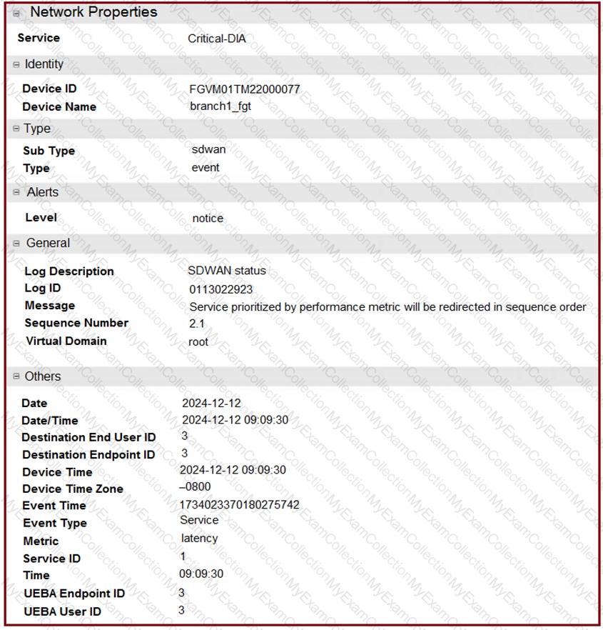 An administrator is testing application steering in SD-WAN. Before generating test traffic, the administrator collected the information shown in the first exhibit. After generating GoToMeeting test traffic, the administrator examined the corresponding traffic log on FortiAnalyzer, which is shown in the second exhibit.