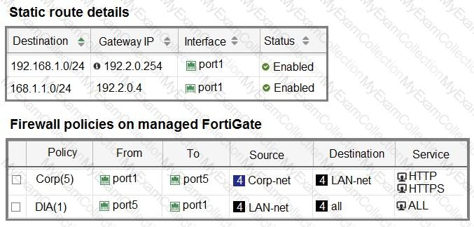 The interface details, static route configuration, and firewall policies on the managed FortiGate device are shown.