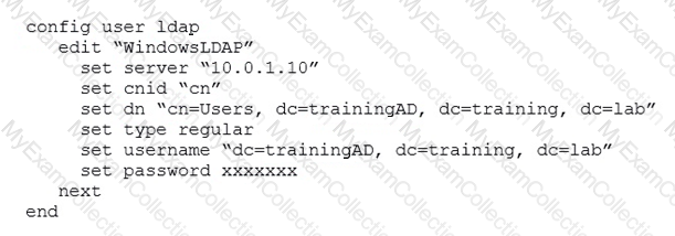 Based on the output, what FortiGate LDAP setting is configured incorrectly?