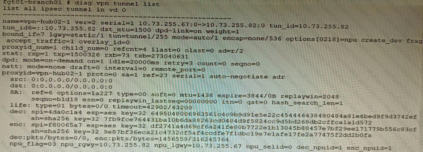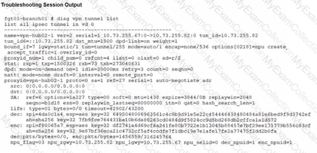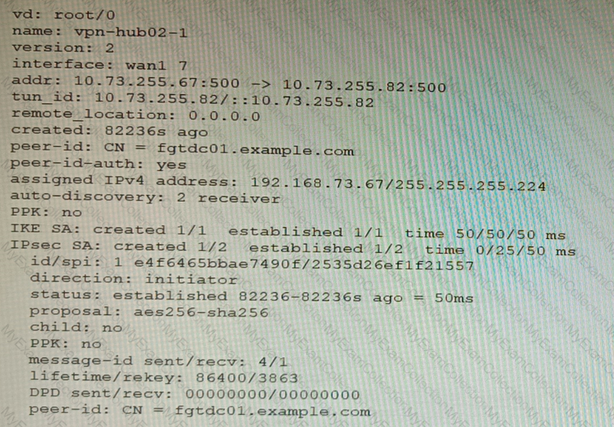 A customer is trying to restore a VPN connection configured on a FortiGate. Exhibits show output during a troubleshooting session when the VPN was working and the current baseline VPN configuration.