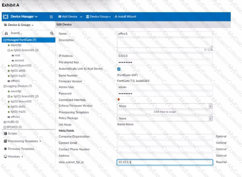 The exhibit shows a FortiGate model device that will be used for zero touch provisioning and a CLI Template.