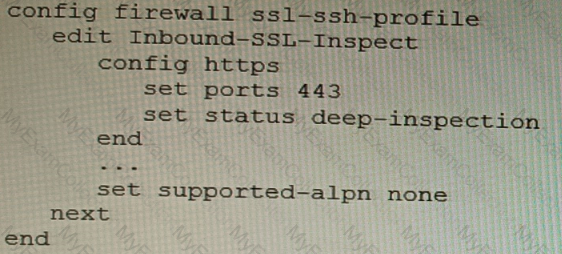 Refer to the CLI configuration of an SSL inspection profile from a FortiGate device configured to protect a web server: