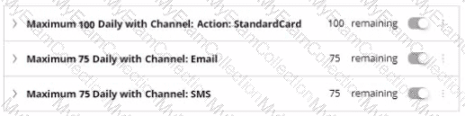 An outbound run identifies 150 Standard card offers, 75 on email, and 75 on the SMS channel. If the following volume constraint Is applied, how many actions are delivered by the outbound run?