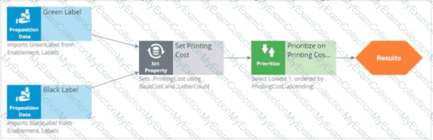 As shown in the following figure, decision strategy contains 'Green Label' and 'Black Label' Proposition components that point to the "Set Printing Cost' Set Property component that uses 'BaseCost' and "LetterCount." The configuration of the Prioritize component selects the lowest cost. What is the role of the Set Property component in the following decision strategy?