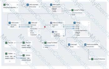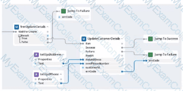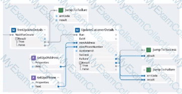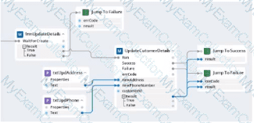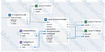 Within your project for a car renting company, you create an automation that reads data From an online form and calls a subautomation that saves that data in the company's application. The UpdateCustomerDetails subautomation has two exit points, Success and Failure, and two output parameters. Result and errCode.