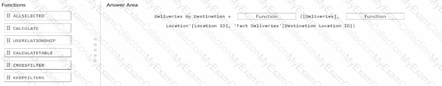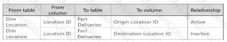 You have a Power B1 semantic model that contains two tables named Dim Location and Fact Deliveries. The relationships between the tables are configured as shown in the following table.