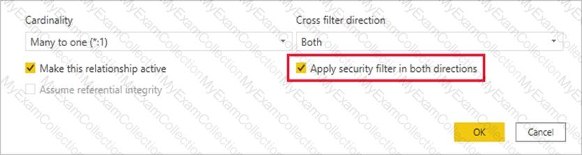 In Power BI Desktop, you are building a sales report that contains two tables. Both tables have row-level security (RLS) configured.