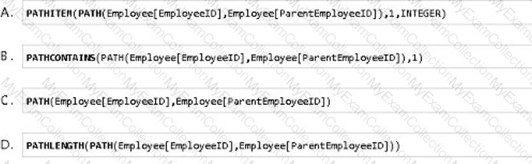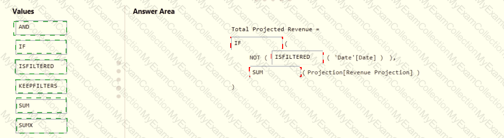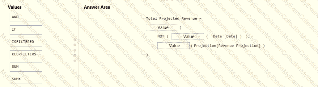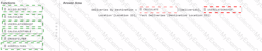 How should you complete the DAX expression? To answer, select the appropriate options in the answer area.