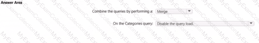 How should you combine the queries, and what should you do on the Categories query? To answer, select the appropriate options in the answer area.