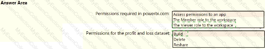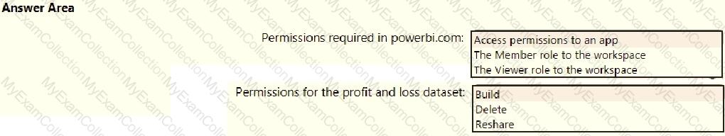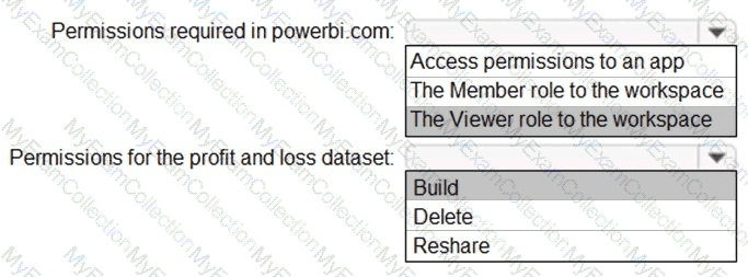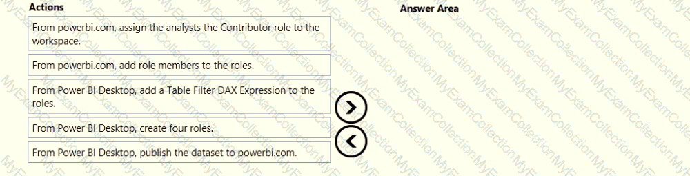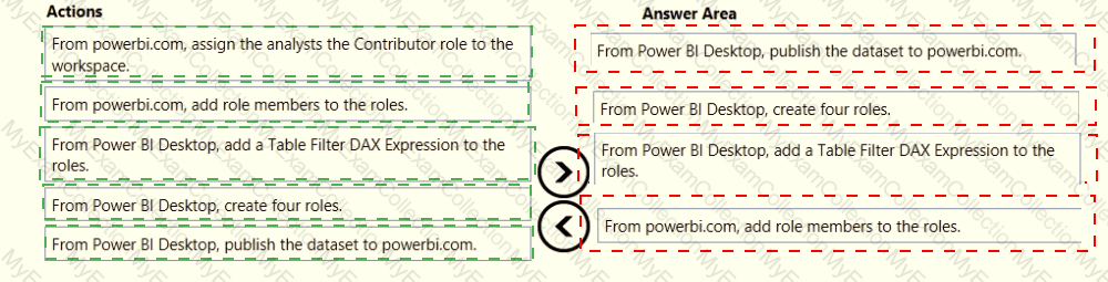 Once the profit and loss dataset is created, which four actions should you perform in sequence to ensure that the business unit analysts see the appropriate profit and loss data? To answer, move the appropriate actions from the list of actions to the answer area and arrange them in the correct order.