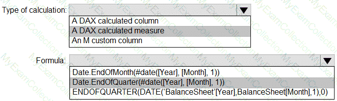 You need to calculate the last day of the month in the balance sheet data to ensure that you can relate the balance sheet data to the Date table. Which type of calculation and which formula should you use? To answer, select the appropriate options in the answer area. NOTE: Each correct selection is worth one point.