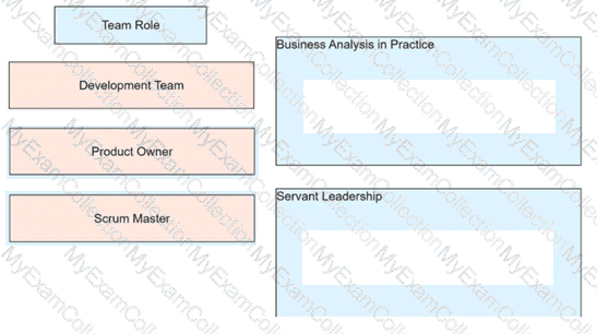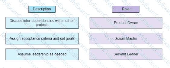 A new project manager for an agile project is reviewing with an established team, some of the roles to avoid confusion on what to expect. Drag the description on the left to the role on the right