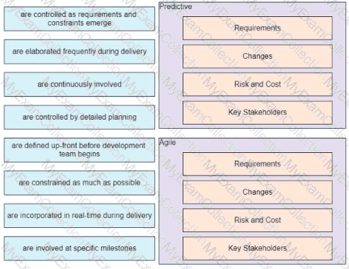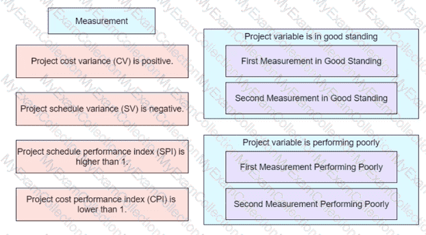For an ongoing project, match the key performance indicators (KPIs) on the left to the correct categories on the right.