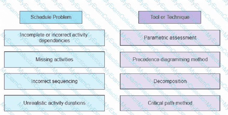 A few months into a project, several schedule issues have emerged Drag the schedule problems on the left to the specific tools on the right that if implemented during schedule development could have prevented the issues.