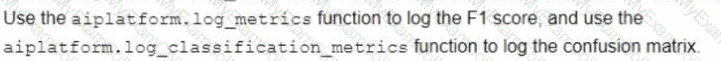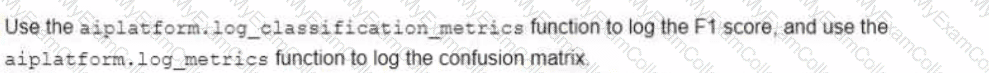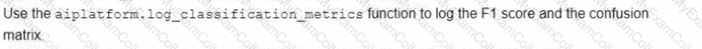 You want to migrate a scikrt-learn classifier model to TensorFlow. You plan to train the TensorFlow classifier model using the same training set that was used to train the scikit-learn model and then compare the performances using a common test set. You want to use the Vertex Al Python SDK to manually log the evaluation metrics of each model and compare them based on their F1 scores and confusion matrices. How should you log the metrics?