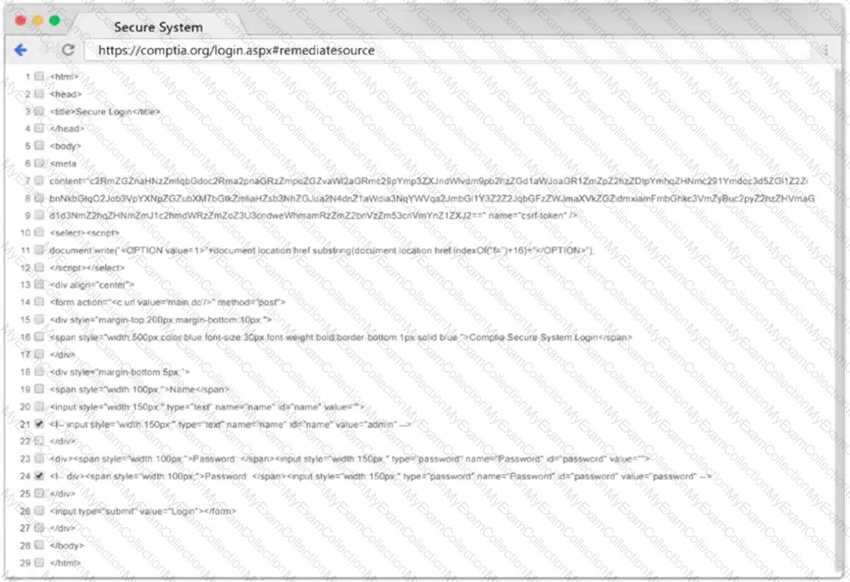 In a file stored in an unprotected source code repository, a penetration tester discovers the following line of code: