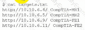 A penetration tester creates a list of target domains that require further enumeration. The tester writes the following script to perform vulnerability scanning across the domains:
