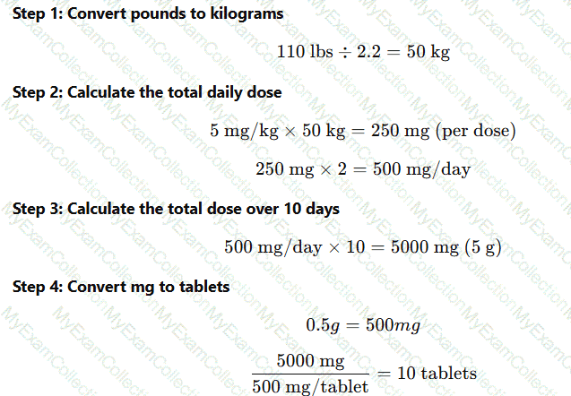 A physician prescribes5 mg/kgof a drugtwice dailyfor a patient weighing110 lbs. How many0.5 g tabletsof the drug are required for a10-day duration?