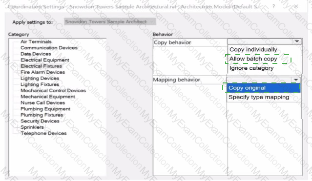 “Set Copy Behavior to Allow batch copy and Mapping Behavior to Copy original when monitoring shared architectural elements like lighting fixtures, ensuring accurate duplication and automatic update tracking.â€