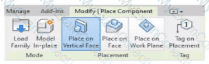 The Placement panel shown in the exhibit — with options such as Place on Vertical Face, Place on Face, and Place on Work Plane — is displayed only when the family being placed was created using a wall-hosted (face-based or vertical face-based) template. This indicates that the family is designed to be hosted on a vertical surface, such as a wall, rather than a floor or level.