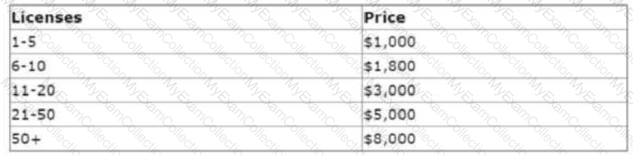 Universal Containers (UC) licenses shipping software that is sold for a fixed price based on each quantity tier as seen in the table below. For example, buying eight licenses would cost a total of $1,800 rather than multiplying unit price by quantity. Further discounts on this product are unavailable.