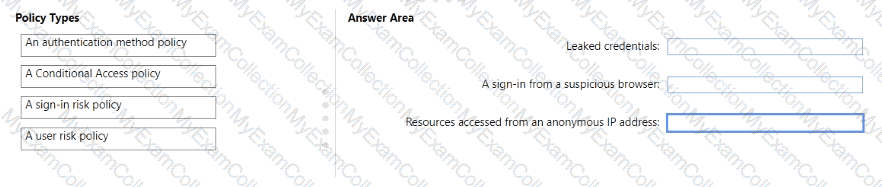 What should you configure for each incident? To answer, drag the appropriate policy types to the correct issues. Each policy type may be used once, more than once, or not at all. You may need to drag the split bar between panes or scroll to view content.