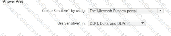 What should you use to create Sensitive1, and in which DLP policies can you use Sensitive1? To answer, select the appropriate options in the answer area.
