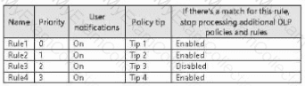 You have a Microsoft 365 E5 subscription that contains a data loss prevention (DLP) policy named DLP1. DLP1 contains the DLP rules shown in the table.