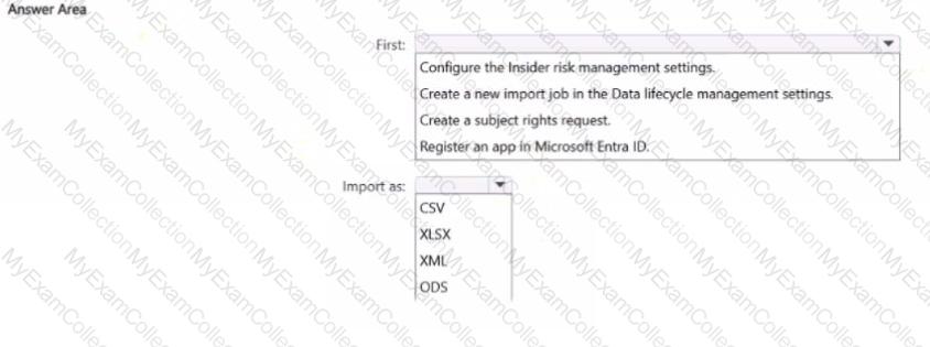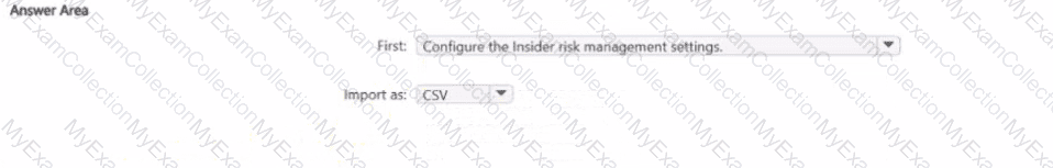 What should you do first and in which format should you import the data? To answer, select the appropriate options in the answer area.