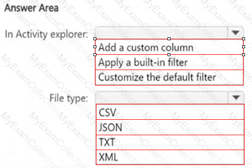 What should you do in Activity explorer before exporting the data, and in which file format is the file exported? To answer, select the appropriate options in the answer area.