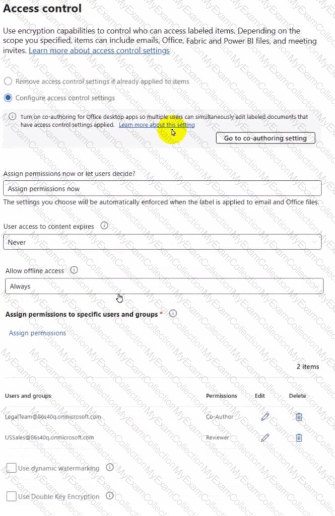 The Access control settings for the sensitivity label are configured as shown in the exhibit (Click the Exhibit tab.)