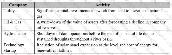 An investment analyst assesses climate-related stranded asset risk for a portfolio of energy companies. The analyst develops a list of companies potentially exhibiting stranded asset risk. After a more granular examination, the analyst summarizes corporate activity in the following table: