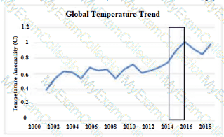 A scientist at a large agricultural company develops an internal presentation that explains weather variation and long-term climate change. The scientist presents global annual temperature anomalies (relative to a 1951-1980 average) throughout the last 20 years:
